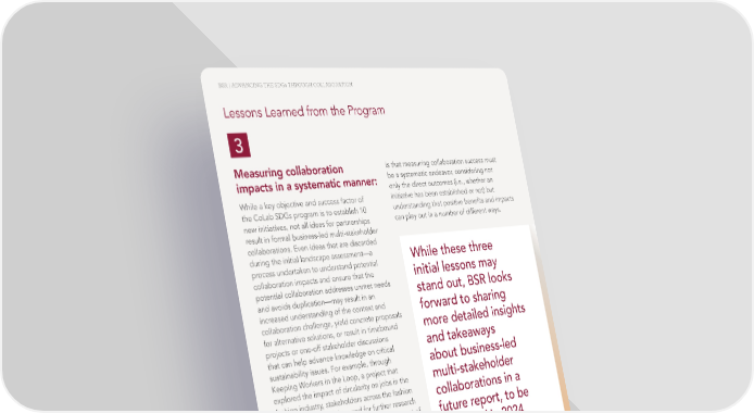 BSR | ADVANCING THE SDGs THROUGH COLLABORATION Lessons Learned from the Program 3 Measuring collaboration is that measuring collaboration success must impacts in a systematic manner: be a systematic endeavor, considering not only the direct outcomes (i.e., whether an While a key objective and success factor of initiative has been established or not) but the CoLab SDGs program is to establish 10 understanding that positive bene昀椀ts and impacts new initiatives, not all ideas for partnerships can play out in a number of different ways. result in formal business-led multi-stakeholder collaborations. Even ideas that are discarded during the initial landscape assessment—a While these three process undertaken to understand potential collaboration impacts and ensure that the initial lessons may potential collaboration addresses unmet needs stand out, BSR looks and avoids duplication—may result in an increased understanding of the context and forward to sharing collaboration challenge, yield concrete proposals for alternative solutions, or result in timebound more detailed insights projects or one-off stakeholder discussions and takeaways that can help advance knowledge on critical sustainability issues. For example, through about business-led Keeping Workers in the Loop, a project that multi-stakeholder explored the impact of circularity on jobs in the fashion industry, stakeholders across the fashion collaborations in a industry uncovered the need for further research on the ecological, social, and economic impact of future report, to be global used-textile product 昀氀ows. While no formal published in 2024. business-led collaboration has been established as a result of initial discussions, a clear need to further understand the multifaceted challenge has been identi昀椀ed. Ultimately, further research in this 昀椀eld will help advance the foundation for solutions and innovative approaches to the global issue of textile waste. What this example demonstrates 13