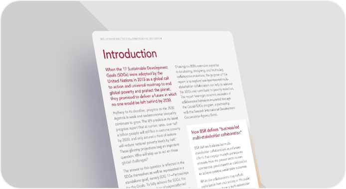 BSR | ADVANCING THE SDGs THROUGH COLLABORATION Introduction When the 17 Sustainable Development Drawing on BSR’s extensive expertise Goals (SDGs) were adopted by the in incubating, designing, and facilitating United Nations in 2015 as a global call collaborative initiatives, the purpose of this to action and universal roadmap to end report is to explore how business-led multi- global poverty and protect the planet, stakeholder collaboration can help to advance they promised to deliver a future in which the SDGs and contribute to poverty reduction. no one would be left behind by 2030. The report leverages concrete examples of collaborative initiatives incubated through Halfway to its deadline, progress on the 2030 the CoLab SDGs program, a partnership Agenda is weak and socioeconomic inequality with the Swedish International Development continues to grow. The UN predicts in its latest Cooperation Agency (Sida). progress report that at current rates, over half a billion people will still live in extreme poverty by 2030, and only around a third of nations How BSR de昀椀nes “business-led 1 will reduce national poverty levels by half. multi-stakeholder collaboration” These gloomy projections beg an important question: Who will step up to act on these BSR de昀椀nes business-led multi- global challenges? stakeholder collaborations as voluntary The answer to this question is re昀氀ected in the efforts that engage multiple participants SDGs themselves as well as represented in a primarily from the private sector in non- standalone goal, namely SDG 17—Partnerships commercial, pre-competitive collaboration for the Goals. To fully achieve the SDGs, the to achieve positive sustainable outcomes. world needs partnerships of unprecedented While the collaborations may include scale and ambition between the private sector, participants from civil society or the public governments, and civil society. sector—making them a multi-stakeholder Multi-stakeholder collaborations are already effort—business actors are the primary well established and a key part of the solution. decision-makers, and solutions developed or In fact, the SDG Actions Platform shows nearly identi昀椀ed in the collaborations leverage the 8,000 commitments and partnerships made by resources and assets of the private sector. stakeholders in support of the implementation of the SDGs2. 1 The-Sustainable-Development-Goals-Report-2023.pdf (un.org) 2 2 SDG Actions Platform | Department of Economic and Social Affairs (un.org)