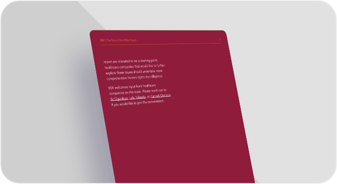 BSR | The Use of AI in Healthcare 2 report are intended to be a starting point; healthcare companies that would like to further explore these issues should undertake more 1 comprehensive human rights due diligence. BSR welcomes input from healthcare companies on this topic. Please reach out to Ife Ogunleye, Lale Tekisalp, or Hannah Darnton if you would like to join the conversation.
