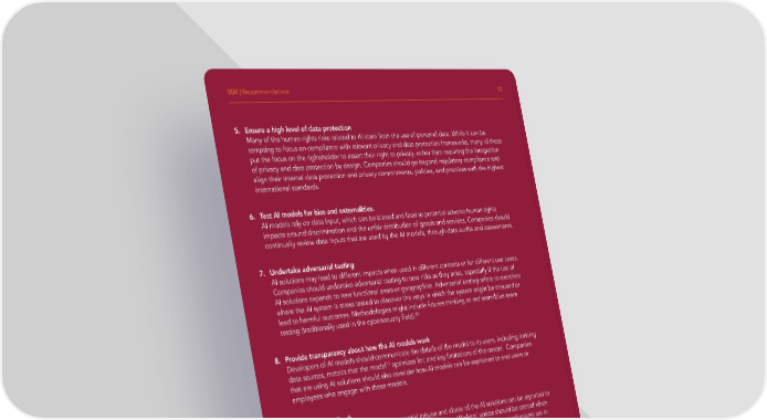 BSR | Recommendations 12 5. Ensure a high level of data protection Many of the human rights risks related to AI stem from the use of personal data. While it can be tempting to focus on compliance with relevant privacy and data protection frameworks, many of these put the focus on the rightsholder to assert their right to privacy, rather than requiring the integration of privacy and data protection by design. Companies should go beyond regulatory compliance and align their internal data protection and privacy commitments, policies, and practices with the highest international standards. 6. Test AI models for bias and externalities. AI models rely on data input, which can be biased and lead to potential adverse human rights impacts around discrimination and the unfair distribution of goods and services. Companies should continually review data inputs that are used by the AI models, through data audits and assessments. 7. Undertake adversarial testing AI solutions may lead to different impacts when used in different contexts or for different use cases. Companies should undertake adversarial testing to new risks as they arise, especially if the use of AI solutions expands to new functional areas or geographies. Adversarial testing refers to exercises where the AI system is stress tested to discover the ways in which the system might be misused or lead to harmful outcomes. Methodologies might include futures thinking or red team/blue team testing (traditionally used in the cybersecurity 昀椀eld).10 8. Provide transparency about how the AI models work Developers of AI models should communicate the details of the model to its users, including training data sources, metrics that the model11 optimizes for, and key limitations of the model. Companies that are using AI solutions should also consider how AI models can be explained to end users or employees who engage with these models. 9. Integrate feedback Establish a reporting channel where potential misuse and abuse of the AI solutions can be reported to the teams or third parties who have developed the solution. Workers’ voices should be central when making decisions on how to deploy a new technology. Ensure that the necessary mechanisms are in place to integrate employee feedback into the way AI solutions are used by the company. 10. Prepare for upcoming regulation EU Corporate Sustainability Ensure that your company is prepared for upcoming regulation (e.g., Due Diligence Directive (CSDDD), proposed EU AI Act). As a 昀椀rst step, companies can either 1) ensure that AI is included in company-wide human rights due diligence processes and/or 2) conduct due diligence on speci昀椀c AI use cases to identify human rights risks.