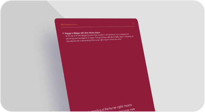 BSR | Recommendations 13 11. Engage in dialogue with other industry players. As the use of AI technologies becomes more prevalent in the healthcare sector, companies are becoming more interested in its impact. Through dialogue with other industry players, companies can help advance the understanding of the human rights impacts of AI in their sector. Our understanding of the human rights impacts of AI will evolve as the technology becomes more pervasive across the healthcare industry. Companies should start putting structures and processes in place to address the adverse impacts of the technologies they are using. However, these systems should be agile to meet future developments and concerns.