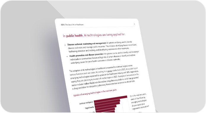BSR | The Use of AI in Healthcare 5 In public health, AI technologies are being applied for: • Disease outbreak monitoring and management: AI systems are being used to identify disease outbreaks and manage public response. This includes identifying disease transmission, facilitating detection and tracking, and developing vaccines and other treatments. • Health promotion and disease prevention: AI systems can be used to identify and microtarget individuals or communities that are at high risk of certain diseases or identify and address underlying causes for poor health outcomes or disease outbreaks. The adoption of AI technologies in healthcare is expected to continue to grow across various functions and use cases. According to a survey conducted in 2022, AI is at the top of emerging technologies expected to uptake in the healthcare industry, with 50% respondents saying they are planning to invest in AI technologies in 2022. Examples of innovations in the sector include Insilico Medicine’s AI-enabled drug discovery platform, which has generated a drug candidate for idiopathic pulmonary 昀椀brosis that has advanced to clinical trials. Uptake of emerging technologies in the next two years Q: In the next two years, which of the following emerging technologies do you expect your organization to invest in? Source: Global Data Recreated from Pharmaceutical Technology