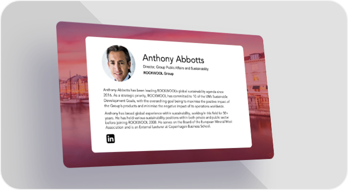 Anthony Abbotts Director, Group Public Affairs and Sustainability ROCKWOOL Group Anthony Abbotts has been leading ROCKWOOL’s global sustainability agenda since 2016. As a strategic priority, ROCKWOOL has committed to 10 of the UN’s Sustainable Development Goals, with the overarching goal being to maximise the positive impact of the Group’s products and minimise the negative impact of its operations worldwide. Anthony has broad global experience within sustainability, working in this field for 30+ years. He has held various sustainability positions within both private and public sector before joining ROCKWOOL 2008. He serves on the Board of the European Mineral Wool Association and is an External Lecturer at Copenhagen Business School.