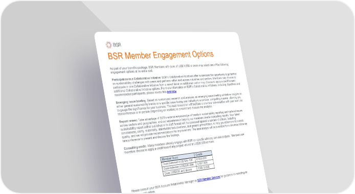 BSR Member Engagement Options As part of your benefits package, BSR Members with dues of US$14,000 or more may select one of the following engagement options at no extra cost. Participation in a Collaborative Initiative: BSR’s Collaborative Initiatives offer businesses the opportunity to go farther on sustainability challenges with peers and partners within and across industries and sectors. Members may choose to participate in one Collaborative Initiative from a select list at no additional cost or may choose to apply a credit toward additional Collaborative Initiative options. For more information on BSR’s Collaborative Initiatives, including objectives and recommended participants, please review this overview. Emerging issue briefing: Based on customized research and analysis, an emerging issue briefing will deliver insights on either general sustainability trends or a specific issue facing your industry in a concise, compelling manner, allowing you to gauge the significance for your business. The lead researcher will facilitate a one-hour conversation with your team via teleconference or in person (depending on location) to present and discuss the analysis. Report review: Take advantage of BSR’s extensive knowledge of trends in sustainability reporting and material issues across sectors and geographies, and our experience in helping our members create compelling reports. Your latest sustainability report (either published or in draft format) will be assessed against a number of criteria, including conciseness, clarity, materiality, stakeholder inclusiveness, and general presentation, to help you determine its overall quality, and we will provide recommendations for improvement. The lead analyst will be available for a one-hour follow-up teleconference to present and discuss the findings. Consulting credit: Many members already engage with BSR on specific advisory services projects. Members can therefore choose to apply a credit toward any project valued at US$30,000 or more. Member Dues Credit Dues between US$10K-19K US$5,000 Dues between US$20K-29K US$7,500 Dues US$30K and above US$10,000 Please consult your BSR Account Relationship Manager or BSR Member Services for guidance on selecting an engagement option. Contact Matthew Charlesworth +1 415 984 3230 or [email protected]