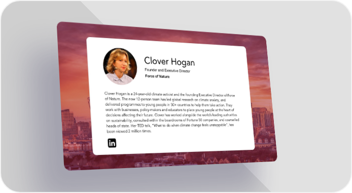 Clover Hogan Founder and Executive Director Force of Nature Clover Hogan is a 24-year-old climate activist and the founding Executive Director of Force of Nature. The now 12-person team has led global research on climate anxiety, and delivered programmes to young people in 50+ countries to help them take action. They work with businesses, policy-makers and educators to place young people at the heart of decisions affecting their future. Clover has worked alongside the world’s leading authorities on sustainability, consulted within the boardrooms of Fortune 50 companies, and counselled heads of state. Her TED talk, “What to do when climate change feels unstoppable”, has been viewed 2 million times.
