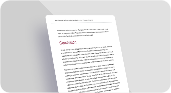 BSR | Co-creation for Climate Justice—Centering Communities in Corporate Climate Action members can voice any concerns of company failures. The business and community should report on progress and share lessons so that co-creations between businesses and affected communities for climate justice can be enhanced and scaled. Conclusion Climate change is one of the greatest contemporary challenges facing our society, presenting an urgent need for business transformation. As businesses navigate challenges and opportunities, it is essential that stakeholders and communities across the value chain that are affected by climate change and climate solutions are actively involved and engaged. Centering affected communities in identifying challenges and developing solutions can help to address systemic injustices and pursue more equitable social, environmental, and climate outcomes. This issue brief emphasizes the importance of co-creating climate justice interventions with affected stakeholders to advance climate justice. It provides a set of principles grounded in meaningful stakeholder engagement and a high-level iterative approach that that can guide businesses in co-creation process. Through an equitable decision-making process, co-creation with affected communities can enhance trust-building, develop effective and meaningful collaboration, and deliver mutual benefits. Affected communities need to be at the center of dialogue, decision-making, and the development of interventions from the beginning because they experience the challenges firsthand and can help identify interventions that will best fit their needs. While it can be time- and resource-intensive to co-create and include a wide range of stakeholders, prioritizing affected communities will ultimately yield more just and sustainable climate solutions. 15