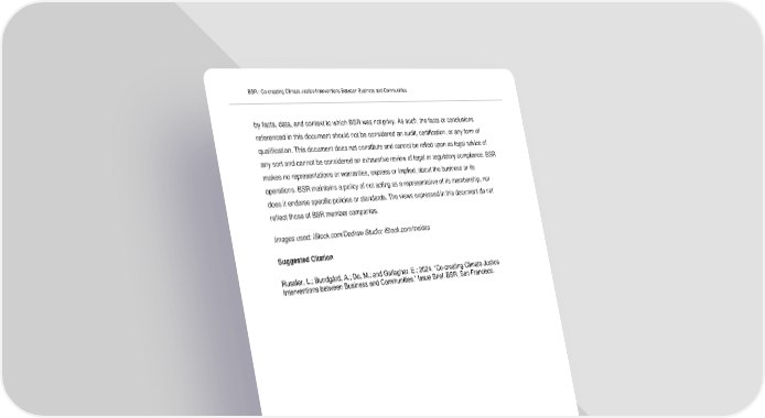 BSR | Co-creating Climate Justice Interventions Between Business and Communities by facts, data, and context to which BSR was not privy. As such, the facts or conclusions referenced in this document should not be considered an audit, certification, or any form of qualification. This document does not constitute and cannot be relied upon as legal advice of any sort and cannot be considered an exhaustive review of legal or regulatory compliance. BSR makes no representations or warranties, express or implied, about the business or its operations. BSR maintains a policy of not acting as a representative of its membership, nor does it endorse specific policies or standards. The views expressed in this document do not reflect those of BSR member companies. Images used: iStock.com/Dedraw Studio; iStock.com/melitas Suggested Citation Russler, L.; Bundgård, A.; Do, M.; and Gallagher, E.; 2024. “Co-creating Climate Justice Interventions between Business and Communities.” Issue Brief. BSR, San Francisco. 3
