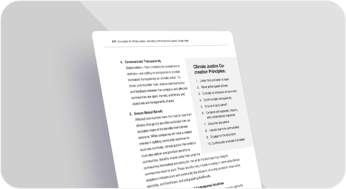 BSR | Co-creation for Climate Justice—Centering Communities in Corporate Climate Action 4. Communicate Transparently Stakeholders—from investors to consumers to Climate Justice Co- workers—are calling on companies to provide creation Principles: increased transparency on climate action. To foster and maintain trust, ensure communication 1. Listen first and listen to learn and feedback between the company and affected 2. Move at the speed of trust communities are open, honest, and timely and 3. Cultivate an inclusive environment objectives are transparently shared. 4. Communicate transparently 5. Ensure Mutual Benefit 5. Ensure mutual benefit Affected communities have the most to lose from 6. Contend with systemic, historic, climate change but are often excluded from an and contemporary injustices equitable share of the benefits from climate 7. Welcome discomfort solutions. While companies will have a vested 8. Include last-mile communities interest in building community resilience for 9. Engage for the long term business continuity, climate justice interventions 10. Continuously evaluate and adapt must also deliver and prioritize benefits to communities. Benefits should come from what the communities themselves are asking for, not what the business may imagine communities need or want. These benefits may include investing in community climate adaptation infrastructure and community-led solutions; ensuring access to clean water, electricity, and healthcare; and safeguarding livelihoods. 6. Contend with Systemic, Historic, and Contemporary Injustices Recognize, take responsibility for, and remedy past and current community harms for which businesses have caused or contributed to and use leverage to address harms the company is linked to. Before acting on climate justice, understand how existing structures, societal norms, and frameworks exclude the needs of disproportionately affected communities and consider how leadership, resources, and decision-making be 4 redirected to those most affected and historically excluded. 4 The Climate Justice Playbook for Business by the B Corp Climate Collective, B Lab, The Skoll Centre for Social Entrepreneurship, and the Climate Action Champion’s Team includes a model on “Making the Mindset Shift,” which presents the shift necessary to move from extractive and exploitative mindsets to equitable and regenerative mindsets. See the model on page 60. 10