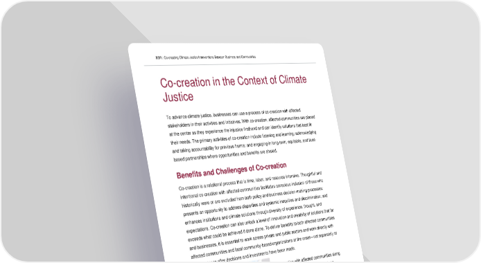 BSR | Co-creating Climate Justice Interventions Between Business and Communities Co-creation in the Context of Climate Justice To advance climate justice, businesses can use a process of co-creation with affected stakeholders in their activities and initiatives. With co-creation, affected communities are placed at the center as they experience the injustice firsthand and can identify solutions that best fit their needs. The primary activities of co-creation include listening and learning; acknowledging and taking accountability for previous harms; and engaging in long-term, equitable, and trust- based partnerships where opportunities and benefits are shared. Benefits and Challenges of Co-creation Co-creation is a relational process that is time, labor, and resource intensive. Thoughtful and intentional co-creation with affected communities facilitates conscious inclusion of those who historically were or are excluded from both policy and business decision-making processes; presents an opportunity to address disparities and systemic inequities and discrimination; and enhances institutions and climate solutions through diversity of experience, thought, and expectations. Co-creation can also unlock a level of innovation and creativity of solutions that far exceeds what could be achieved if done alone. To deliver benefits to both affected communities and businesses, it is essential to work across private and public sectors and work directly with affected communities and local community-based organizations at the onset—not separately or at later stages after decisions and investments have been made. Co-creation, in the context of Collaboration with affected communities along climate justice, centers affected the value chain requires an emphasis on communities in ongoing listening and responding to their needs and discussions to identify recommendations. Co-creation is a bottom-up, solutions that address collective approach rather than being top-down systemic injustices and and prescriptive. Before engaging with communities or civil society organizations on advance equitable social, climate justice issues, it is important to be environmental, and climate cognizant of the challenges that may arise, outcomes. including but not limited to fragile relationships 7