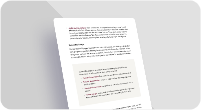 • Ability to limit features: Many SaaS services have a plan-based pricing structure in which different plans include different features. Some providers offer a “freemium” model in which the customer begins with a free plan with limited features. Those clients can opt to pay for some of the premium features. This allows SaaS providers to limit the use of some of the potentially riskier features, which may have advantages for human rights due diligence. Vulnerable Groups Companies should pay particular attention to the rights, needs, and challenges of individuals from groups or populations that may be at heightened risk of becoming vulnerable. Vulner- able groups are those that face marginalization, discrimination, or exposure to other adverse human rights impacts with greater severity and/or less potential for remediation than others. Vulnerability depends on context. Someone who may be powerful in one context may be vulnerable in another. Examples include: • Formal discrimination: laws or policies that favor one group over another • Societal discrimination: cultural or social practices that marginalize some and favor others • Practical discrimination: marginalization due to life circumstances, such as poverty • Hidden groups: people, such as undocumented migrants, who might need to remain hidden and consequently may not speak up for their rights SaaS providers should endeavor to identify vulnerable groups whose rights, needs, and chal- lenges require extra attention during the design, growth, and development of their services. In the context of end-use, SaaS services may impact different groups of rightsholders. As outlined in section three of this report, these groups include, but are not limited to, the direct user of the service and the end-user. Other “non-user” groups of rightsholders may also experience impacts along the downstream value chain of the SaaS service. 33 Human Rights Assessment of the Software-as-a-Service Sector