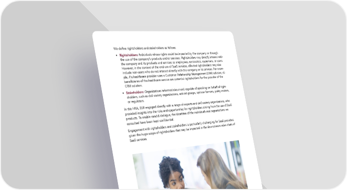 We define rightsholders and stakeholders as follows: • Rightsholders: Individuals whose rights could be impacted by the company or through the use of the company’s products and/or services. Rightsholders may directly interact with the company and its products and services as employees, contractors, customers, or users. However, in the context of the end-use of SaaS services, affected rightsholders may also include non-users who do not interact directly with the company or its services. For exam- ple, if a healthcare provider uses a Customer Relationship Management (CRM) solution, all beneficiaries of the healthcare service are potential rightsholders for the provider of the CRM solution. • Stakeholders: Organizations informed about and capable of speaking on behalf of right- sholders, such as civil society organizations, activist groups, opinion formers, policy makers, or regulators. In this HRA, BSR engaged directly with a range of experts and civil society organizations, who provided insights into the risks and opportunities for rightsholders arising from the use of SaaS products. To enable candid dialogue, the identities of the individuals and organizations we consulted have been kept confidential. Engagement with rightsholders and stakeholders is particularly challenging for SaaS providers given the huge scope of rightsholders that may be impacted in the downstream value chain of SaaS services. 11 Human Rights Assessment of the Software-as-a-Service Sector