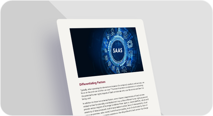 Differentiating Factors Typically, when assessing the downstream impacts of a company’s products and services, we 3 The most important considerations in evaluating focus on the end-user and the use case. the potential human rights impacts of SaaS services are who uses the service and how it is being used. In addition to these two external factors, some inherent characteristics of SaaS services related to their functionality and deployment may surface different human rights issues and provide various degrees of leverage to address them: open vs. closed platform, volume and sensitivity of data processed, level of automation involved, level of interoperability, cloud versus on-premises, sales model, level of customizability, level of substitutability. Each of these characteristics represents a spectrum; the risk profile of a SaaS service may change based on where it falls on these spectrums. Human Rights Impacts We identified five main areas of impact for B2B SaaS services: 1. Customer end-use: As they are positioned further up the value chain, one of the biggest risk areas for B2B SaaS services is customer end-use. Who uses the service, which country they are in, and what they use the service for may lead to drastically different human rights impacts. 2. Privacy and data governance: Most SaaS services rely on data input to serve their purpose. Which data is collected, how, and how that data is stored and used may impact the privacy of end-users and employees. 2 Human Rights Assessment of the Software-as-a-Service Sector