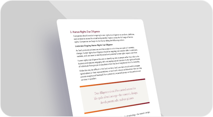 3. Human Rights Due Diligence Companies should conduct ongoing human rights due diligence on products, platforms, and services to assess for actual and potential impacts across the full range of human rights. Companies can begin to do this by taking the following actions: Undertake Ongoing Human Rights Due Diligence As SaaS products and services and the context in which they are used will inevitably change, human rights due diligence should be ongoing and consider shifts in customers, markets, and use cases to identify actual and potential human rights impacts over time. Human rights due diligence focuses on identifying risks to people rather than risks to the business and requires engaging with and paying special attention to the rights and needs of individuals from groups or populations that may be at heightened risk of vulnerability. While this may be difficult in the SaaS context, SaaS providers should work to engage rightsholders or their representatives, or work with industry collaborations that can help provide insights and feedback from potentially impacted groups on the products and services in question. Due diligence should be carried across the life cycle of technology—the research, design, development, sale, and use phases. Due diligence should be carried across the life cycle of technology—the research, design, development, sale, and use phases. Establish Relationships with Customers When possible, establish partnership-based relationships with SaaS customers. This will allow SaaS providers further insight into how customers use the service in practice and may facilitate risk identification and mitigation. This could include regular meetings (e.g., annually) about their use of SaaS tools and features, particularly with the teams and individuals interacting directly with the solution and familiar with the spectrum of use cases. This may be more feasible with customized offerings where the SaaS provider, customer, and/or partner work hand-in-hand on the design and development of a service, or where updates and ongoing maintenance or services are required. 38 Human Rights Assessment of the Software-as-a-Service Sector
