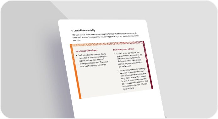 4. Level of interoperability The SaaS service model increases opportunities to integrate different software services. For some SaaS services, interoperability with other apps is an important feature that may surface new risks. MORE INTEROPERABLE Less interoperable software More interoperable software • SaaS providers may be more closely • If a SaaS service can easily be inte- connected to potential human rights grated with others, the combined use LESS INTEROPERABLEimpacts and may have increased of these services may increase the leverage to address them if their soft- likelihood of human rights impacts, ware is not integrated with others. and they may be less foreseeable by the SaaS provider. • Interoperability reduces the technolog- ical barrier of integration for compli- cated software processes such as facial recognition. Consequently, it is easier for users to access or deploy capabili- ties such as surveillance activities, which can increase the likelihood of human rights violations. 47 Human Rights Assessment of the Software-as-a-Service Sector