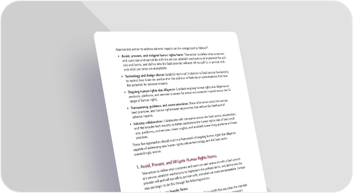28 Appropriate action to address adverse impacts can be categorized as follows : • Avoid, prevent, and mitigate human rights harm: Take action to define what customers and users can and cannot do with the service, establish mechanisms to implement the poli- cies and terms, and define who the SaaS provider will and will not sell to, or partner with, and what use cases are acceptable. • Technology and design choice: Establish technical limitations to SaaS service functionality to restrict how it can be used and/or the addition of features or customizations that have the potential for adverse impacts. • Ongoing human rights due diligence: Conduct ongoing human rights due diligence on products, platforms, and services to assess for actual and potential impacts across the full range of human rights. • Transparency, guidance, and communications: Share information about the service, best practices, and human rights-based approaches that reduce the likelihood of adverse impacts. • Industry collaboration: Collaborate with companies across the SaaS sector, stakeholders, and the broader tech industry to better understand the human rights risks of SaaS prod- ucts, platforms, and services; share insights; and establish overarching guidance and best practices. These five approaches should exist in a framework of ongoing human rights due diligence capable of addressing new human rights risks as technology, and the SaaS sector overarchingly, evolve. 1. Avoid, Prevent, and Mitigate Human Rights Harms Take action to define what customers and users can and cannot do with a SaaS provid- er’s service, establish mechanisms to implement the policies/terms, and define who the provider will and will not sell to, partner with, and what use cases are acceptable. Compa- nies can begin to do this through the following actions: AUPs and Service Specific Terms Deploy, and ideally publish, an Acceptable Use Policy (AUP) that describes the intended use of the SaaS service; the prohibited uses, content or activity; and the company’s 29 Public AUPs set clear expectations for customer use and provide a enforcement practices. clear basis for enforcement actions when the policy is violated. In addition to the AUP, deploy tailored service-specific terms for individual products and services that restrict how they are used and address risks specific to that service. SaaS providers could also consider including service termination clauses in the case of severe human rights violations by customers. Customer Gating Institute a “gating process” for prospective SaaS customers. The gating process is intended to help companies establish boundaries and limitations on who they will and will not do business with and consider how they will implement these limitations. 35 Human Rights Assessment of the Software-as-a-Service Sector