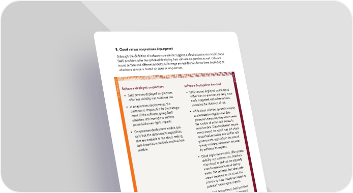 5. Cloud versus on-premises deployment Although the definition of software-as-a-service suggests a cloud-based service model, some SaaS providers offer the option of deploying their software on-premises as well. Different issues surface and different amounts of leverage are needed to address them depending on whether a service is hosted on cloud or on-premises. CLOUD Software deployed on-premises Software deployed on the cloud ON-PREMISES• SaaS services deployed on-premises • SaaS services deployed on the cloud offer less visibility into customer use. rather than on-premises are likely more • In on-premises deployments, the easily integrated with other services, customer is responsible for the manage- increasing the likelihood of risk. ment of the software, giving SaaS • While cloud solutions generally employ providers less leverage to address sophisticated encryption and data potential human rights impacts. protection measures, they also increase • On-premises deployment models typi- the number of actors with access to cally lack the data security capabilities sensitive data. Data localization require- that are available in the cloud, making ments around the world may put cloud- data breaches more likely and less fore- based SaaS providers into conflict with seeable. governments, especially in the case of privacy-violating information requests by authoritarian regimes. • Cloud deployment models offer greater visibility into customer use; therefore, risks related to end-use are arguably more foreseeable in cloud deploy- ments. This indicates that when soft- ware is deployed on the cloud, the provider is more closely connected to potential human rights impacts. • In cloud deployments, SaaS providers are responsible for the management of the software, giving them greater leverage to address potential human rights impacts. 48 Human Rights Assessment of the Software-as-a-Service Sector