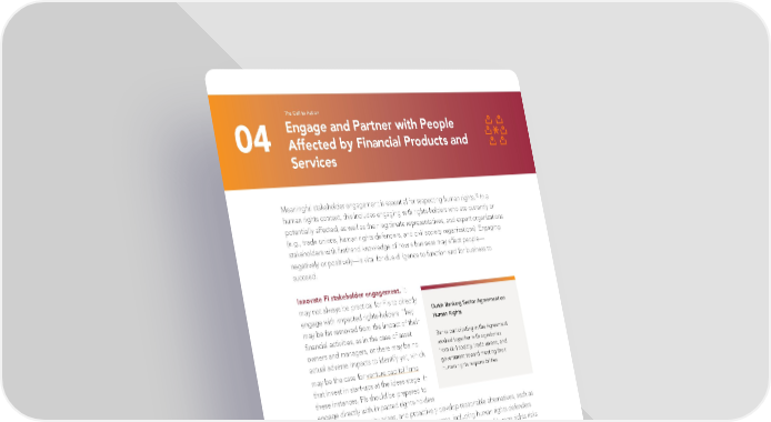 The Call to Action Engage and Partner with People 04 Affected by Financial Products and Services 12 Meaningful stakeholder engagement is essential for respecting human rights. In a human rights context, this includes engaging with rights-holders who are currently or potentially affected, as well as their legitimate representatives, and expert organizations (e.g., trade unions, human rights defenders, and civil society organizations). Engaging stakeholders with firsthand knowledge of how a business may affect people— negatively or positively—is vital for due diligence to function and for business to succeed. Innovate FI stakeholder engagement. It may not always be practical for FIs to directly engage with impacted rights-holders. They Dutch Banking Sector Agreement on may be far removed from the impact of their Human Rights financial activities, as in the case of asset Banks participating in the Agreement owners and managers, or there may be no worked together with signatories actual adverse impacts to identify yet, which from civil society, trade unions, and may be the case for venture capital firms government toward meeting their human rights responsibilities. that invest in start-ups at the ideas stage. In these instances, FIs should be prepared to engage directly with impacted rights-holders where the opportunity arises, and proactively develop reasonable alternatives, such as engaging credible, independent expert resources, including human rights defenders and others from civil society to inform institutional understanding of human rights risks and how to manage them. Elevate stakeholder voice among clients and portfolio companies. Assess a company’s policies and practices regarding stakeholder engagement as well as the effectiveness of their grievance mechanisms to ensure understanding of what is happening on the ground. Use leverage with clients and portfolio companies to promote meaningful stakeholder engagement. Elevating stakeholder voice and perspectives in corporate governance of investee companies may also include reserving board seats for workers, promoting opportunities for employee ownership, and calling 13 for the creation of stakeholder advisory councils for boards. 23 HUMAN RIGHTS ROADMAP FOR TRANSFORMING FINANCE