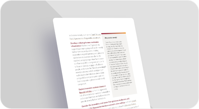 and access remedy, such as the Dutch Pension Fund Agreement on Responsible Investment. Who provides remedy? Develop a robust grievance mechanism Some FIs, such as private equity infrastructure that involves (1) proactively firms or banks providing project supporting company preparedness for remedy lending, may be more likely than before harm occurs by communicating others to contribute to, or in some expectations regarding remedy and grievance cases cause, adverse impacts through their relationships with clients and mechanisms to investees and clients; (2) portfolio companies. In these cases, reactively using leverage where harm occurs FIs are expected to cease the action to influence portfolio companies and clients causing the harm and play a direct to focus on remedy, engage with affected role in providing remedy. Where an FI has contributed to harm, they are people, and ensure that there is a meaningful also expected use their leverage to remedy outcome; and (3) participating in influence other actors contributing to multi-stakeholder initiatives where clients the harm to mitigate the harm and and portfolio companies participate and to provide remedy. However, even if that incorporate a grievance and remedy FIs are not contributing to harm, they may still be directly linked to adverse component. human rights impacts through their products and services. FIs should use Explore innovative contract clauses or their leverage to promote and enable financial vehicles up front to capture the remedy for victims of their value risk of harm/adverse investment externalities chains. and ensure that there are funds available to provide remedy before harm occurs. Consider the innovations and lessons from grievance mechanisms and accountability frameworks that have evolved in other settings, such as in project and development finance. Networks and platforms, such as the Grievance Redress and Accountability Mechanism partnership, exist to build capacity and a community of practice for FIs and other entities in their efforts to meet the UNGPs’ requirements. Central to making progress on remedy are efforts to shift institutional culture. While difficult to achieve, when cultural changes within FIs reach a tipping point, the changes can be profound. It takes strong leadership, clear communication, and the need to view complaints not simply as a source of reputational risk, but as a source of learning that is essential for improved performance and accountability. 25 HUMAN RIGHTS ROADMAP FOR TRANSFORMING FINANCE