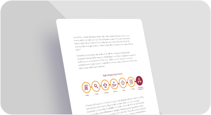 In practice, it means adopting human rights policy commitments and carrying out ex-ante and ongoing human rights due diligence to know if they are connected to human rights risks and show the steps they take to address these risks. It calls for applying their leverage to ensure clients and portfolio companies also respect human 1 rights. Embedding human rights standards in ESG efforts provides a consistent and comparable framework for assessing the full spectrum of risks to people in investment portfolios and across the three ESG pillars, which provides navigation across the constantly evolving landscape on topics like diversity, equity, and inclusion (DEI), labor, data privacy, and the just transition. Rights-Respecting Finance Policy Screen Leverage Remedy Track Disclose Stakeholder Engagement A human rights approach involves engaging a broad group of stakeholders, including rights-holders and those who legitimately represent them, such as civil society organizations, human rights defenders, and trade unions—all of whom can illuminate the real-world impacts of business on people. Such engagement provides valuable qualitative data on corporate conduct that FIs often lack. It also helps create solutions that meaningfully address rights-holders’ concerns and builds trust with stakeholders. Unlike ESG, a human rights approach is agnostic about whether human rights impacts Rights-holders are those stakeholders are financially material to a business and whose individual human rights or instead requires that all adverse human rights collective rights, such as those of impacts are prevented and addressed. Human Indigenous Peoples, are or could be rights due diligence is a holistic, forward- affected by business. looking, and process-based framework that helps FIs proactively and systematically identify risks that are or may become material over time (i.e., dynamic materiality). 13 HUMAN RIGHTS ROADMAP FOR TRANSFORMING FINANCE