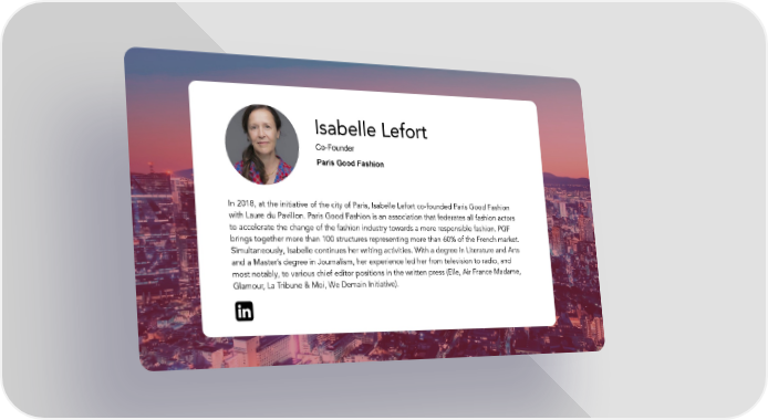Isabelle Lefort Co-Founder Paris Good Fashion In 2018, at the initiative of the city of Paris, Isabelle Lefort co-founded Paris Good Fashion with Laure du Pavillon. Paris Good Fashion is an association that federates all fashion actors to accelerate the change of the fashion industry towards a more responsible fashion. PGF brings together more than 100 structures representing more than 60% of the French market. Simultaneously, Isabelle continues her writing activities. With a degree in Literature and Arts and a Master’s degree in Journalism, her experience led her from television to radio, and most notably, to various chief editor positions in the written press (Elle, Air France Madame, Glamour, La Tribune & Moi, We Demain Initiative).
