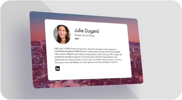Julie Dugard Manager, Climate Change BSR Julie is part of BSR’s climate change team, where she develops climate change and sustainability strategies for BSR members across multiple industries. Prior to joining BSR, Julie worked in Mazars’s sustainability services practice, where she was a CSR manager. She audited and advised companies on their ESG data, CSR and climate ambitions, risk approaches over a broad range of sectors (retail, automotive industry, services, insurance). During her time within Mazars, Julie also spent six months at the Mexico City office.