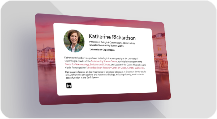 Katherine Richardson Professor in Biological Oceanography, Globe Institute & Leader Sustainability Science Centre University of Copenhagen Katherine Richardson is a professor in biological oceanography at the University of Copenhagen, leader of the Sustainability Science Centre, a principle investigator in the Center for Macroecology, Evolution and Climate, and Leader of the Queen Margrethe’s and Vigdís Finnbogadóttir´s Interdisciplinary Research Centre on Ocean, Climate, and Society. Her research focuses on the importance of biological processes in the ocean for the uptake of CO2 from the atmosphere and how ocean biology, including diversity, contributes to ocean function in the Earth System.