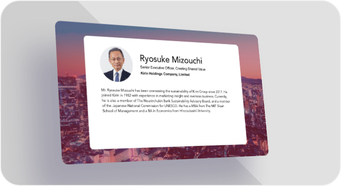 Ryosuke Mizouchi Senior Executive Officer, Creating Shared Value Kirin Holdings Company, Limited Mr. Ryosuke Mizouchi has been overseeing the sustainability of Kirin Group since 2017. He joined Kirin in 1982 with experience in marketing insight and overseas business. Currently, he is also a member of The Nourinchukin Bank Sustainability Advisory Board, and a member of the Japanese National Commission for UNESCO. He has a MBA from The MIT Sloan School of Management and a BA in Economics from Hitotsubashi University.