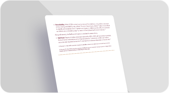 • Remediability: While OCSEA content can be removed from platforms, it may still be in circulation 14 online, making remediability very unlikely. The lack of reporting by children makes it more dif昀椀cult to identify and remediate harms. Furthermore, impacts on children are often dif昀椀cult to remediate 15 as children are a vulnerable group “by reason of [their] physical and mental immaturity.” Along with severity, the likelihood of impacts is considered to assess saliency. • Likelihood: Reports of online enticement increased by 82% in 2022, with an increase in emerging forms of online victimization such as 昀椀nancial sextortion. Furthermore, in 2020 over 3 million 16 accounts were registered across the 10 most harmful child sexual abuse sites on the dark web. (1) Principle 11 of the UNGPs states that companies should address adverse human rights impacts with which they are involved. (2) Principle 19 of the UNGPs states that companies should seek to use and increase their leverage to prevent or mitigate adverse impacts, such as via capacity-building or collaborating with other actors. 14 Disrupting Harm: End Violence Against Children. 15 Geneva Declaration on the Rights of the Child. 16 Global Threat Assessment 2021: WeProtect Global Alliance. BSR TECH COALITION HUMAN RIGHTS IMPACT ASSESSMENT 22