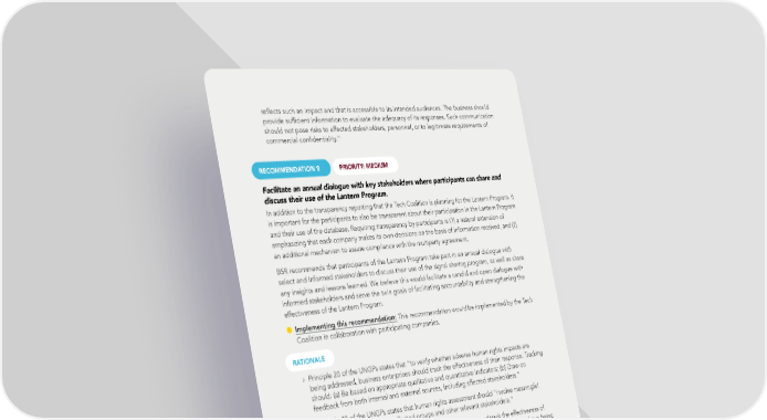 re昀氀ects such an impact and that is accessible to its intended audiences. The business should provide suf昀椀cient information to evaluate the adequacy of its responses. Such communication should not pose risks to affected stakeholders, personnel, or to legitimate requirements of commercial con昀椀dentiality.” RECOMMENDATION 8 PRIORITY: MEDIUM Facilitate an annual dialogue with key stakeholders where participants can share and discuss their use of the Lantern Program. In addition to the transparency reporting that the Tech Coalition is planning for the Lantern Program, it is important for the participants to also be transparent about their participation in the Lantern Program and their use of the database. Requiring transparency by participants is (1) a natural extension of emphasizing that each company makes its own decisions on the basis of information received, and (2) an additional mechanism to assure compliance with the multiparty agreement. BSR recommends that participants of the Lantern Program take part in an annual dialogue with select and informed stakeholders to discuss their use of the signal sharing program, as well as share any insights and lessons learned. We believe this would facilitate a candid and open dialogue with informed stakeholders and serve the twin goals of facilitating accountability and strengthening the effectiveness of the Lantern Program. Implementing this recommendation: This recommendation would be implemented by the Tech Coalition in collaboration with participating companies. RATIONALE › Principle 20 of the UNGPs states that “to verify whether adverse human rights impacts are being addressed, business enterprises should track the effectiveness of their response. Tracking should: (a) Be based on appropriate qualitative and quantitative indicators; (b) Draw on feedback from both internal and external sources, including affected stakeholders.” › Principle 18 of the UNGPs states that human rights assessment should “involve meaningful consultation with potentially affected groups and other relevant stakeholders.” › Principle 1 of the CRBPs states that companies should “monitor and track the effectiveness of the business’s responses in order to verify whether an adverse impact on children’s rights is being addressed, using appropriate qualitative and quantitative indicators and drawing on feedback from internal and external sources, including affected children, families, and other stakeholders.” RECOMMENDATION 9 PRIORITY: HIGHER Establish a strategy for ongoing stakeholder engagement. Engagement with affected stakeholders and other experts underpins a human rights-based approach; building strong feedback loops through stakeholder engagement while avoiding engagement fatigue will be an important balance to strike, particularly as the Tech Coalition launches the Lantern Program and scales usage to a wider group of participants. BSR TECH COALITION HUMAN RIGHTS IMPACT ASSESSMENT 54