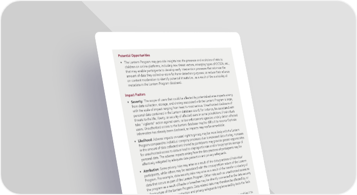 Potential Opportunities • The Lantern Program may provide insights into the presence and evolution of risks to children on online platforms, including new threat vectors, emerging types of OCSEA, etc., that may enable participants to develop early intervention processes that minimize the amount of data they collect or store for harm-detection purposes; or reduce their reliance on content moderation to identify potential threats (i.e., as a result of the availability of metadata in the Lantern Program database). Impact Factors • Severity: The scope of users that could be affected by potential adverse impacts arising from data collection, storage, and sharing associated with the Lantern Program is large, with the scale of impact ranging from least to most serious. Unauthorized disclosure of personal data contained in the Lantern database could, for instance, be associated with threats to the life, liberty, or security of affected users in some jurisdictions if individuals take “vigilante” action against users, or law enforcement agencies unduly detain affected users. Unauthorized access to the Lantern database may be dif昀椀cult to reverse if private information has already been disclosed, so impacts may not be remediable. • Likelihood: Adverse impacts on users’ right to privacy may be more likely with the Lantern Program compared to individual company processes due to increased data sharing. Increases in the amount of data collected and shared by participants may provide greater opportunities for unauthorized access to data or lead to disproportionate and/or inappropriate storage of personal data. The adverse impacts arising from the data practices of participants may be effectively mitigated by adequate data protection and privacy safeguards. • Attribution: Some privacy risks may arise as a result of the data practices of individual participants, while others may be associated with the cross-platform nature of the Lantern Program. For example, data security risks may arise as a result of the transfer or sharing of data that occurs as part of the Lantern Program. Other risks such as unauthorized access to the program as a result of hacks or breaches may be directly connected to the data security infrastructure of the Lantern Program. Data related risks may therefore be affected by, or connected to, the data protection and privacy safeguards implemented by both the Tech Coalition and participants. • Leverage: The Tech Coalition’s position as lead party in the Lantern Program enables it to provide guidance to participants on signal sharing and data practices associated with the program and review compliance with applicable privacy laws and recommended practices. However, the Tech Coalition’s leverage may be limited by the fact that privacy or data protection risks may arise on participants’ individual platforms or on ThreatExchange. BSR TECH COALITION HUMAN RIGHTS IMPACT ASSESSMENT 34