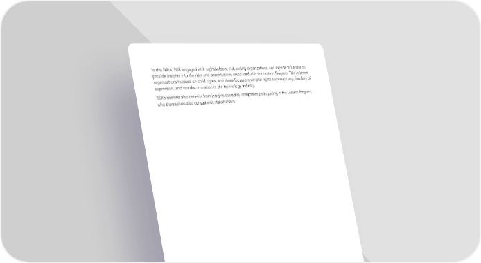 In this HRIA, BSR engaged with rightsholders, civil society organizations, and experts to be able to provide insights into the risks and opportunities associated with the Lantern Program. This included organizations focused on child rights, and those focused on digital rights such as privacy, freedom of expression, and nondiscrimination in the technology industry. BSR’s analysis also bene昀椀ts from insights shared by companies participating in the Lantern Program, who themselves also consult with stakeholders. BSR TECH COALITION HUMAN RIGHTS IMPACT ASSESSMENT 18