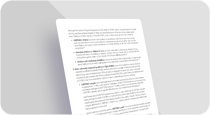 Although the Lantern Program helps promote the safety of OCSEA victims, risks associated with signal sharing may have adverse impacts on them and exacerbate some of the harms they already experi- ence. While all children may be victims of OCSEA, some children are at particular risk, including: • LGBTQIA+ children are three times as likely to experience risky interactions online as they seek out and rely on online communities for exploration and perceived safety. They are also more likely to not report unsafe interactions out of fear of being cut off from online interactions 28 completely. • Homeless children or children in care are more vulnerable to attempts by offenders trying to bond with them. According to research, children who are in foster care or involved with the 29 child welfare system make up the majority of child sex traf昀椀cking victims. • Children with intellectual disabilities may not be aware of what is appropriate or inappropriate 30 sexual behavior by an adult, making them more vulnerable to sexual abuse and exploitation. 2. Users adversely impacted by efforts to 昀椀ght OCSEA: Users of tech platforms may be adversely impacted by efforts to address OCSEA, such as overbroad or wrongful content removal and other actions (e.g., account suspensions). While all users of tech platforms are at risk, certain vulnerable populations are at greater risk of being wrongly accused of OCSEA, and/or being wrongfully accused of OCSEA may have more severe impacts on certain vulnerable populations, including: • LGBTQIA+ people have historically faced unfounded assertions that they are child molesters 31 In the current political landscape, certain OCSEA behaviors, such as grooming, or pedophiles. 32 are weaponized against LGBTQIA+ people. Similarly, medical procedures associated with 33 LGBTQIA+ people, such as gender-af昀椀rming care, are characterized as child abuse. Such biases about LGBTQIA+ people may lead to a higher likelihood of LGBTQIA+ people being wrongly accused of OCSEA on tech platforms, and a higher likelihood of unsubstan- tiated signals associated with them being shared on the Lantern Program. Similarly, there is a higher likelihood of LGBTQIA+ content (e.g., content related to transgender medical care) being signaled and removed. Special attention should be paid to LGBTQIA+ youth, who may be disproportionately signaled as a result of self-generated explicit imagery and minor-on-minor interactions because they are 34 and particularly particularly dependent on online platforms to explore their sexual identity vulnerable to harm. 35 • Sex workers utilize online platforms as an important avenue for advertising their services. There is a higher likelihood of sex workers being wrongfully accused of OCSEA because they share more content that is sexual in nature, and due to political and social biases against sex work. 28 New Research from Thorn: LGBTQIA+ Minors are 3X More Likely to Experience Unwanted and Risky Online Interactions. 29 Human Traf昀椀cking and Child Welfare: A Guide for Child Welfare Agencies: US Department of Health & Human Services. 30 Children with Disabilities and Sexual Abuse: Risk Factors and Best Practice: American Bar Association. 31 The Long, Sordid History of the Gay Conspiracy Theory: New York magazine. 32 What Is “Grooming?” The Truth Behind the Dangerous, Bigoted Lie Targeting the LGBTQIA+ Community: ADL. 33 How Medical Care for Transgender Youth Became ‘Child Abuse’ in Texas: New York Times. 34 Online Communities and LGBTQIA+ Youth: Human Rights Campaign. 35 Posting into the Void: Studying the Impact of Shadowbanning on Sex Workers and Activists: hacking // hustling. BSR TECH COALITION HUMAN RIGHTS IMPACT ASSESSMENT 44