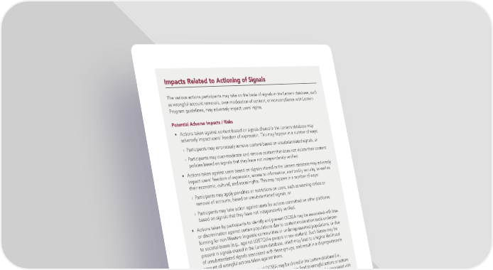 Impacts Related to Actioning of Signals The various actions participants may take on the basis of signals in the Lantern database, such as wrongful account removals, over-moderation of content, or noncompliance with Lantern Program guidelines, may adversely impact users’ rights. Potential Adverse Impacts / Risks • Actions taken against content based on signals shared in the Lantern database may adversely impact users’ freedom of expression. This may happen in a number of ways: › Participants may erroneously remove content based on unsubstantiated signals, or › Participants may over-moderate and remove content that does not violate their content policies based on signals that they have not independently veri昀椀ed. • Actions taken against users based on signals shared in the Lantern database may adversely impact users’ freedom of expression, access to information, and bodily security, as well as their economic, cultural, and social rights. This may happen in a number of ways: › Participants may apply penalties or restrictions on users, such as warning strikes or removal of accounts, based on unsubstantiated signals, or › Participants may take action against users for actions committed on other platforms based on signals that they have not independently veri昀椀ed. • Actions taken by participants to identify and prevent OCSEA may be associated with bias or discrimination against certain populations due to content moderation tools underper- forming for non-Western linguistic communities or underrepresented populations, or due to societal biases (e.g., against LGBTQIA+ people or sex workers). Such biases may be present in signals shared in the Lantern database, which may lead to a higher likelihood of unsubstantiated signals associated with these groups, and result in a disproportionate amount of wrongful actions taken against them. • Signals outside the de昀椀ned scope of OCSEA may be shared in the Lantern database (i.e., scope creep). Actioning of such signals by participants may lead to wrongful actions or actions that are not necessary and proportionate for addressing OCSEA, which may be associated with adverse impacts on users’ right to privacy, freedom of expression, and other rights. • Following erroneous actions, participants may fail to provide effective remedy to users. For example: › Participants may fail to adequately provide explanations to users for actions taken on the basis of signals shared in the Lantern database that enable users to exercise rights of appeal, or › Users may not be provided appropriate mechanisms to appeal actions taken on the basis of signals shared in the Lantern database, or › Participants may fail to provide appropriate remedy for harm suffered as a result of erroneous actions, or institute remedial steps (e.g., account reinstitution or deletion of an erroneous signal from the Lantern database) in a timely manner to effectively remedy the harm. BSR TECH COALITION HUMAN RIGHTS IMPACT ASSESSMENT 35