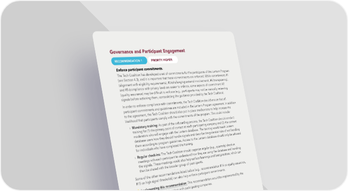 Governance and Participant Engagement RECOMMENDATION 1 PRIORITY: HIGHER Enforce participant commitments. The Tech Coalition has developed a set of commitments for the participants of the Lantern Program (see Section 4.3), and it is important that these commitments are enforced. While commitments #1 (alignment with eligibility requirements), #3 (challenging external involvement), #4 (transparency), and #5 (compliance with privacy laws) are easier to enforce, some aspects of commitment #2 (quality assurance) may be dif昀椀cult to enforce (e.g., participants may not be manually reviewing signals before actioning them, contradicting the guidance provided by the Tech Coalition). In order to enforce compliance with commitments, the Tech Coalition should ensure that all participant commitments and guidelines are included in the Lantern Program agreement. In addition to the agreement, the Tech Coalition should also put in place mechanisms to help increase the likelihood that participants comply with the commitments of the program. This could include: › Mandatory training: As part of the onboarding process, the Tech Coalition should conduct training for (1) the primary point of contact at each participating company and (2) the content moderators who will engage with the Lantern database. The training would teach Lantern database users how they should handle signals and describe the potential risks of not handling them according to program guidelines. Access to the Lantern database should only be allowed for individuals who have completed this training. › Regular check-ins: The Tech Coalition should organize regular (e.g., quarterly) check-in meetings with each participant to understand how they are using the database and handling the signals. These meetings would also help surface learnings and best practices, which can then be shared with the broader group of participants. Some of the other recommendations listed below (e.g., recommendation #14 on quality assurance, #15 on high signal thresholds) can also help enforce participant commitments. Implementing this recommendation: This recommendation would be implemented by the Tech Coalition in collaboration with participating companies. RATIONALE › Principle 19 of the UNGPs states that where a company has leverage to prevent or mitigate adverse impacts, it should exercise it; and where a company lacks leverage, it should seek ways to increase it—for example, by offering capacity-building or other incentives to the related entity, or by collaborating with other actors. › Principle 16 of the UNGPs states that human rights policy should be “supported by any necessary training for personnel in relevant business functions.” BSR TECH COALITION HUMAN RIGHTS IMPACT ASSESSMENT 48