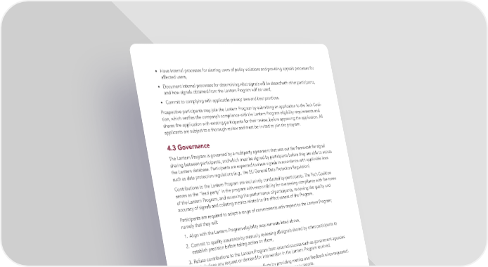 • Have internal processes for alerting users of policy violations and providing appeals processes for affected users, • Document internal processes for determining what signals will be shared with other participants, and how signals obtained from the Lantern Program will be used, • Commit to complying with applicable privacy laws and best practices. Prospective participants may join the Lantern Program by submitting an application to the Tech Coali- tion, which veri昀椀es the company’s compliance with the Lantern Program eligibility requirements and shares the application with existing participants for their review, before approving the application. All applicants are subject to a thorough review and must be invited to join the program. 4.3 Governance The Lantern Program is governed by a multiparty agreement that sets out the framework for signal sharing between participants, and which must be signed by participants before they are able to access the Lantern database. Participants are expected to share signals in accordance with applicable laws such as data protection regulations (e.g., the EU General Data Protection Regulation). Contributions to the Lantern Program are exclusively conducted by participants. The Tech Coalition serves as the “lead party” in the program with responsibility for overseeing compliance with the terms of the Lantern Program, and reviewing the performance of participants, reviewing the quality and accuracy of signals and collating metrics related to the effectiveness of the Program. Participants are required to adopt a range of commitments with respect to the Lantern Program; namely that they will: 1. Align with the Lantern Program eligibility requirements listed above, 2. Commit to quality assurance by manually reviewing all signals shared by other participants to establish precision before taking action on them, 3. Refuse contributions to the Lantern Program from external sources such as government agencies and disclose any request or demand for intervention in the Lantern Program received, 4. Support Tech Coalition’s transparency efforts by providing metrics and feedback when requested. Participants are also expected to publish their own transparency reports. 5. Comply with applicable data protection and privacy laws. In the case of a violation of the Lantern Program requirements or participant commitments, the Tech Coalition provides timely notice of the violation to relevant participants and collaborates with participants to correct the violative action. The Tech Coalition is also empowered to remove participants from the Lantern Program for violations of the terms of the multiparty agreement, move the Lantern Program off the ThreatExchange platform to a different host platform, or terminate the multiparty agreement. BSR TECH COALITION HUMAN RIGHTS IMPACT ASSESSMENT 20