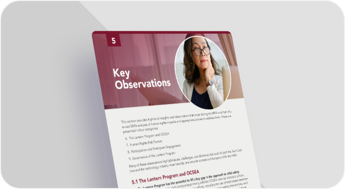 5 Key Observations This section provides high-level insights and observations that arose during the HRIA and that in昀氀u- enced BSR’s analysis of human rights impacts and appropriate actions to address them. These are presented in four categories: 6. The Lantern Program and OCSEA 7. Human Rights Risk Factors 8. Participation and Participant Engagement 9. Governance of the Lantern Program Many of these observations highlight issues, challenges, and dilemmas that exist for both the Tech Coali- tion and the technology industry more broadly, and provide context and background for the HRIA. 5.1 The Lantern Program and OCSEA • The Lantern Program has the potential to 昀椀ll a key gap in the approach to child safety and protection. Currently, tech companies primarily address OCSEA risks via individual actions, 17: (1) through their content moderation efforts, including the use of hash-based detection including tools and machine learning classi昀椀ers to detect CSAM; (2) implementing safety interventions, such as age veri昀椀cation and prevention / deterrence messaging targeting potential victims and those seeking to do harm; and (3) once OCSEA cases are identi昀椀ed, by conducting threat investigations and reporting to relevant authorities as part of their legal obligations in different jurisdictions (e.g., to NCMEC in the US). However, research suggests that OCSEA perpetrators are increasingly operating across multiple plat- forms in an effort to avoid detection. For example, after meeting a child on a social media platform or online forum, a perpetrator may ask the child to move their conversation to a private or encrypted 18 This cross-platform nature of the crime necessitates an additional and collabo- messaging service. rative approach to the industry’s existing content moderation efforts. The Lantern Program aims to address this critical need and strengthen existing efforts to 昀椀ght OCSEA. • The Lantern Program can help companies address some of the most severe adverse human 17 Harnessing the Power of Industry Collaboration: Tech Coalition 2022 Annual Report. 18 Online Grooming: Examining Risky Encounters Amid Everyday Digital Socialization. BSR TECH COALITION HUMAN RIGHTS IMPACT ASSESSMENT 23