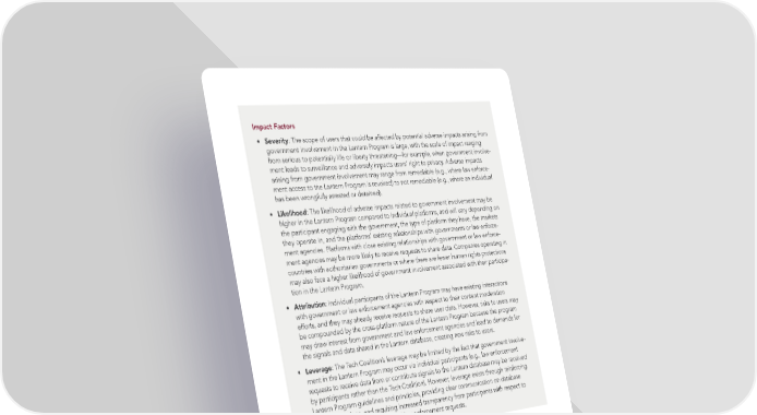 Impact Factors • Severity: The scope of users that could be affected by potential adverse impacts arising from government involvement in the Lantern Program is large, with the scale of impact ranging from serious to potentially life or liberty threatening—for example, when government involve- ment leads to surveillance and adversely impacts users’ right to privacy. Adverse impacts arising from government involvement may range from remediable (e.g., where law enforce- ment access to the Lantern Program is revoked) to not remediable (e.g., where an individual has been wrongfully arrested or detained). • Likelihood: The likelihood of adverse impacts related to government involvement may be higher in the Lantern Program compared to individual platforms, and will vary depending on the participant engaging with the government, the type of platform they have, the markets they operate in, and the platforms’ existing relationships with governments or law enforce- ment agencies. Platforms with close existing relationships with government or law enforce- ment agencies may be more likely to receive requests to share data. Companies operating in countries with authoritarian governments or where there are fewer human rights protections may also face a higher likelihood of government involvement associated with their participa- tion in the Lantern Program. • Attribution: Individual participants of the Lantern Program may have existing interactions with government or law enforcement agencies with respect to their content moderation efforts, and they may already receive requests to share user data. However, risks to users may be compounded by the cross-platform nature of the Lantern Program because the program may draw interest from government and law enforcement agencies and lead to demands for the signals and data shared in the Lantern database, creating new risks to users. • Leverage: The Tech Coalition’s leverage may be limited by the fact that government involve- ment in the Lantern Program may occur via individual participants (e.g., law enforcement requests to receive data from or contribute signals to the Lantern database may be received by participants rather than the Tech Coalition). However, leverage exists through reinforcing Lantern Program guidelines and principles, providing clear communication on database access restrictions, and requiring increased transparency from participants with respect to their response to government and law enforcement requests. BSR TECH COALITION HUMAN RIGHTS IMPACT ASSESSMENT 38