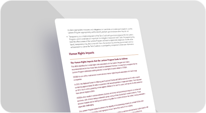 in place appropriate measures and mitigations to incentivize and enable participants to use the Lantern Program appropriately, and to identify and act upon instances when they do not. • Transparency is a critical component of the Tech Coalition’s governance approach for the Lantern Program, and it constitutes an important risk mitigation measure in itself. Lack of transparency may limit the effectiveness of the Lantern Program and lead to stakeholder skepticism. On the other hand, transparency may also come with risks—for example, by attracting governments and law enforcement to coerce the Tech Coalition or participating companies to share user information. Human Rights Impacts The Human Rights Impacts that the Lantern Program Seeks to Address This HRIA identi昀椀es the human rights risks associated with the Lantern Program and makes recommendations for how those risks should be addressed. However, it is essential to recognize that the Lantern Program addresses existing adverse human rights impacts related to OCSEA. OCSEA is one of the most severe known adverse human rights impacts associated with technology companies. In 2022, the National Center for Missing and Exploited Children (NCMEC) received over 32 million reports containing approximately 88 million suspected child sexual exploitation images and videos. There has been an 82% rise in online grooming crimes against children in the last 昀椀ve years, and reports of online sextortion have almost tripled in 2023. OCSEA often results in serious adverse physical, emotional, and psychological impacts on victims and survivors, with children being a vulnerable group owing to their physical and mental immaturity. These adverse impacts can be lasting and continue long after the incident of abuse has ended, making remediation especially challenging. The Lantern Program seeks to enhance the capacity of the technology industry to combat OCSEA, and thereby address one of the most egregious known harms that exists in the industry. The Lantern Program helps companies ful昀椀ll their responsibility to address adverse human rights impacts with which they are already associated and will signi昀椀cantly increase their leverage to do so e昀昀ectively. BSR identi昀椀es the following eight categories of human rights that may be impacted with the use of the Lantern Program. Some of these categories have multiple human rights grouped together. • Child Safety and Protection: The Lantern Program seeks to promote the enjoyment of children’s right to protection from sexual abuse and exploitation by establishing effective procedures to identify, prevent, and mitigate threats to children’s safety on digital platforms. BSR TECH COALITION HUMAN RIGHTS IMPACT ASSESSMENT 6