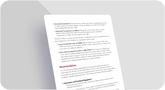• Government Involvement: Governments and law enforcement agencies may attempt to gain direct or indirect access to the Lantern database, or in昀氀uence participants’ use of the Lantern Program in ways that adversely impact users’ rights. • Unintended Consequences on Children: Although the Lantern Program exists to promote children’s safety and protection rights, the use of the database may have unintended consequences on children, adversely impacting their rights. The Tech Coalition should pay particular attention to individuals from groups or populations that may be at heightened risk of vulnerability or marginalization. These include: 1. Actual and potential victims of OCSEA: While all children may be victims of OCSEA, some children are at particular risk, including LGBTQIA+ children, homeless children or children in care, and children with intellectual disabilities. 2. Users adversely impacted by efforts to 昀椀ght OCSEA: While all users of tech platforms are at risk, certain vulnerable populations are at greater risk of being wrongly accused of OCSEA. Also, being wrongfully accused of OCSEA may have more severe impacts on certain vulnerable populations, including LGBTQIA+ people, sex workers, people with intellectual disabilities, people of color, underrepresented linguistic communities, and children. Recommendations The Tech Coalition has already made signi昀椀cant efforts to prevent, mitigate, and address the human rights risks associated with the Lantern Program. Section 7 of this assessment provides 19 recommendations across four key areas to supplement and enhance the Tech Coalition’s existing efforts, as well as to underline certain areas of focus. The following is a summary of the recommendations: 1. Governance and Participant Engagement › Enforce participant commitments by conducting mandatory training and regular check-in meetings with participants. › Ensure that participants have a process in place for handling government requests for user data, including applying human rights principles when responding to requests and publishing an annual transparency report. › Support smaller participants’ ability to comply with the requirements of the Lantern Program by providing additional quality assurance and integration support. › Provide guidance and best practice to participants—for example, on how to conduct signal sharing, handle gray areas, and provide educational resources to children. › Establish a due diligence process for evaluating new members and ensuring that they have the necessary policies, processes, and culture in place to address the risks associated with signal sharing. › Consider participation by “non-tech” industries, such as airlines or 昀椀nancial services companies, that can provide signals related to OCSEA through their own use of technology, with careful consideration of new risks that may arise from such participation. BSR TECH COALITION HUMAN RIGHTS IMPACT ASSESSMENT 8