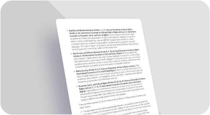 • Equality and Nondiscrimination (Articles 1, 2, 7, Universal Declaration of Human Rights; Articles 3, 26, International Covenant on Civil and Political Rights; Articles 2, 3, International Covenant on Economic, Social, and Cultural Rights): Certain groups or communities may be at greater risk of being wrongly accused of OCSEA and be subject to investigations or punitive actions, due to societal biases (e.g., against LGBTQIA+ people and sex workers), or content moderation tools may not perform as accurately for certain groups (e.g., people of color) and languages. The Lantern Program can proactively address these biases and discriminatory practices by setting guardrails and sharing insights with the broader 昀椀eld. • Due Process and Effective Remedy (Article 8, 9, 10, Universal Declaration on Human Rights; Articles 2, 14 International Covenant on Civil and Political Rights): When participants take action based on signals shared in the Lantern Program database, this may result in content being removed and user accounts being deleted or 昀氀agged for monitoring. In such cases, users may be penalized without notice for conduct or actions taken outside of a platform, and they may not be provided effective or accessible avenues for appeals or complaints mechanisms. • Bodily Security (Articles 3, 5, 9, Universal Declaration of Human Rights; Articles 6, 7, 9, International Covenant on Civil and Political Rights): There is a risk that actions taken on the basis of signals shared in the Lantern Program may wrongfully result in of昀氀ine harms to users such as arbitrary arrest, detention, or investigation of users, particularly if signals are shared with and misused by governments or law enforcement agencies. • Economic, Social, and Cultural Rights (Articles 23, 25, 26, 27, Universal Declaration of Human Rights; Articles 7, 11, 13, 15, International Covenant on Economic, Social and Cultural Rights): Digital platforms have become an integral part of social, cultural, and economic life including the facilitation of work and education, and participation in cultural life. The Lantern Program may adversely affect users’ ability to enjoy these rights if users are wrongfully denied access to platforms as a result of signals shared in the database. There are three important points to note about the prioritization of these potential adverse human rights impacts: • The eight salient human rights categories listed here are a narrowed list of potential salient risks that cross a threshold of relevance for the Tech Coalition. In other words, there are other potential adverse human rights impacts that are already excluded from this list of salient human rights issues. • BSR has reviewed these eight salient human rights issues using the criteria of severity (scope, scale, remediability) and likelihood described in the Methodology section. However, BSR notes that (1) prioritization is more directional than precise and (2) all human rights are indivisible, interdependent, and interrelated, and the deprivation of one right adversely affects others. In other words, the connections between these rights can be as important as their relative salience. For example, all the rights listed are child rights (even though child rights are also listed as a salient issue), and violation of freedom of expression might impact the right to education. • According to the UNGPs, the Tech Coalition has a responsibility to address all adverse human rights impacts. Prioritization on the basis of severity is encouraged when it is not possible to address all impacts simultaneously, but it does not remove the Tech Coalition’s responsibility to address all adverse human rights impacts. BSR TECH COALITION HUMAN RIGHTS IMPACT ASSESSMENT 32