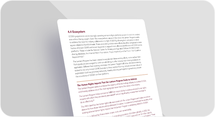 4.4 Ecosystem OCSEA perpetrators are increasingly operating across multiple platforms as part of a tactic to conduct acts without being caught. Given this cross-platform nature of the crime, the Lantern Programs seeks to address the need for industry collaboration to 昀椀ght OCSEA by allowing tech companies to share signals related to harmful threats. There are existing collaborative efforts that allow companies to share hashes of known CSAM and known keywords to support more effective identi昀椀cation of OCSEA across platforms. These include the National Center for Missing and Exploited Children (NCMEC)’s hash- sharing database, the Internet Watch Foundation, Project Arachnid, and the Thorn / Tech Coalition Keyword Hub.8 The Lantern Program has been created to supplement these existing efforts, not to replace them. Participants are encouraged to continue submitting to other industry hash-sharing databases as applicable. Different from existing initiatives, the Lantern Program will allow information sharing related to not only known CSAM, but also to threat vectors that may indicate imminent abuse or exploitation (such as grooming behaviors), thereby allowing participants to proactively prevent the occurrence of OCSEA on their platforms. The Human Rights Impacts That the Lantern Program Seeks to Address The Lantern Program seeks to enhance the capacity of the technology industry to combat OCSEA, and thereby address one of the most egregious known harms that exists in the industry. The Lantern Program helps companies ful昀椀ll their responsibility to address adverse human rights (1) impacts with which they are already associated and will signi昀椀cantly increase their leverage to do so effectively.(2) This HRIA identi昀椀es the human rights risks associated with the Lantern Program and makes recommen- dations for how those risks should be addressed. However, it is essential to emphasize the severity of the existing adverse human rights impacts that the Lantern Program is addressing related to OCSEA. Severity is de昀椀ned by three criteria: scope, scale, and remediability. • Scope: OCSEA impacts a large and expanding population of children globally. In 2022, the National Center for Missing and Exploited Children (NCMEC) received over 32 million reports 9 containing approximately 88 million suspected child sexual exploitation images and videos. There 10 and reports has been an 82% rise in online grooming crimes against children in the last 昀椀ve years, 11 of online sextortion have almost tripled in 2023. • Scale: OCSEA often results in serious adverse physical, emotional, and psychological impacts on victims and survivors. For example, studies show that OCSEA is linked with higher risk of self-harm 12 Such direct physical and psychological harm is likely to be lasting, and and suicidal ideation. may continue even after the incident of abuse has ended. In a survey conducted with survivors of OCSEA, 70% of respondents reported constant worry about being recognized through images of their abuse, and reported feelings of continuing abuse due to the existence of the sexual abuse material online.13 8 Harnessing the Power of Industry Collaboration: Tech Coalition 2022 Annual Report. 9 2022 Annual Report: NCMEC. 10 82% Rise in Online Grooming Crimes against Children in the Last 5 Years: NSPCC. 11 Sexual Extortion and Child Abuse Reports Almost Triple: Australian eSafety Commissioner. 12 Disrupting Harm: End Violence Against Children. 13 Survivors’ Survey Executive Summary: Canadian Centre for Child Protection. BSR TECH COALITION HUMAN RIGHTS IMPACT ASSESSMENT 21