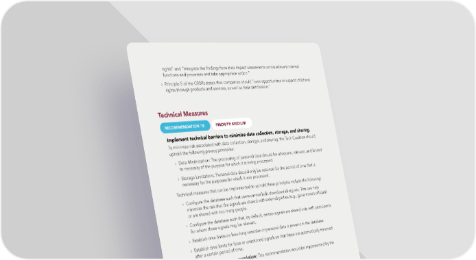 rights” and “integrate the 昀椀ndings from their impact assessments across relevant internal functions and processes and take appropriate action.” › Principle 5 of the CRBPs states that companies should “seek opportunities to support children’s rights through products and services, as well as their distribution.” Technical Measures RECOMMENDATION 18 PRIORITY: MEDIUM Implement technical barriers to minimize data collection, storage, and sharing. To minimize risk associated with data collection, storage, and sharing, the Tech Coalition should uphold the following privacy principles: › Data Minimization: The processing of personal data should be adequate, relevant, and limited to necessity of the purpose for which it is being processed. › Storage Limitations: Personal data should only be retained for the period of time that is necessary for the purposes for which it was processed. Technical measures that can be implemented to uphold these principles include the following: › Con昀椀gure the database such that users cannot bulk download all signals. This can help minimize the risk that the signals are shared with external parties (e.g., government of昀椀cials) or are shared with too many people. › Con昀椀gure the database such that, by default, certain signals are shared only with participants for whom those signals may be relevant. › Establish time limits on how long sensitive or personal data is present in the database. › Establish time limits for false or unactioned signals so that these are automatically removed after a certain period of time. Implementing this recommendation: This recommendation would be implemented by the Tech Coalition and Meta. RATIONALE › Principle 19 of the UNGPs states that “If the business enterprise has leverage to prevent or mitigate the adverse impact, it should exercise it. And if it lacks leverage there may be ways for the enterprise to increase it.” › Principle 5 of the CRBPs states that companies should “seek opportunities to support children’s rights through products and services, as well as their distribution.” › Privacy and data protection principles based on the human rights framework include data mini- mization and storage limitation, among others. BSR TECH COALITION HUMAN RIGHTS IMPACT ASSESSMENT 61