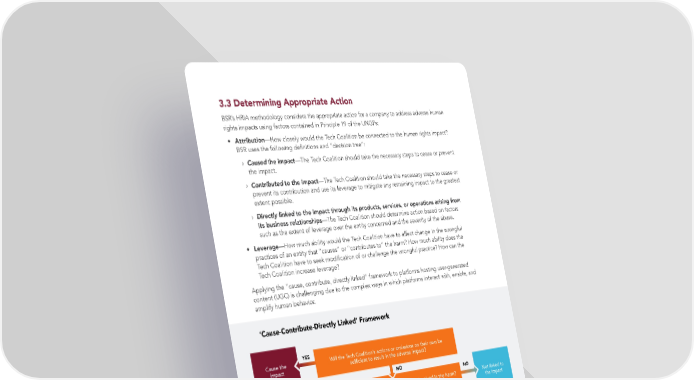 3.3 Determining Appropriate Action BSR’s HRIA methodology considers the appropriate action for a company to address adverse human rights impacts using factors contained in Principle 19 of the UNGPs: • Attribution—How closely would the Tech Coalition be connected to the human rights impact? BSR uses the following de昀椀nitions and “decision tree”: › Caused the impact—The Tech Coalition should take the necessary steps to cease or prevent the impact. › Contributed to the impact—The Tech Coalition should take the necessary steps to cease or prevent its contribution and use its leverage to mitigate any remaining impact to the greatest extent possible. › Directly linked to the impact through its products, services, or operations arising from its business relationships—The Tech Coalition should determine action based on factors such as the extent of leverage over the entity concerned and the severity of the abuse. • Leverage—How much ability would the Tech Coalition have to affect change in the wrongful practices of an entity that “causes” or “contributes to” the harm? How much ability does the Tech Coalition have to seek modi昀椀cation of or challenge the wrongful practice? How can the Tech Coalition increase leverage? Applying the “cause, contribute, directly linked” framework to platforms hosting user-generated content (UGC) is challenging due to the complex ways in which platforms interact with, enable, and amplify human behavior. ‘Cause-Contribute-Directly Linked’ Framework Cause the YES Will the Tech Coalition’s actions or omissions on their own be impact suf昀椀cient to result in the adverse impact? NO NO Not linked to Will the Tech Coalition’s products or services be involved in the harm? the impact YES Contribute to NO Are the Tech Coalition’s due diligence efforts, including efforts the impact to prevent or mitigate the impact, of suf昀椀cient quality? YES YES Will the Tech Coalition take actions (or fail to take actions) that NO Directly linked Contribute to encourage, facilitate, incentivize, motivate, or enable another to the impact the impact entity to cause an adverse impact? BSR TECH COALITION HUMAN RIGHTS IMPACT ASSESSMENT 16