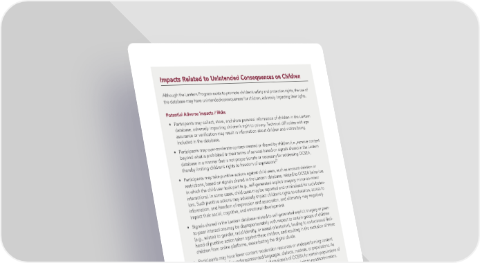 Impacts Related to Unintended Consequences on Children Although the Lantern Program exists to promote children’s safety and protection rights, the use of the database may have unintended consequences for children, adversely impacting their rights. Potential Adverse Impacts / Risks • Participants may collect, store, and share personal information of children in the Lantern database, adversely impacting children’s right to privacy. Technical dif昀椀culties with age assurance or veri昀椀cation may result in information about children and victims being included in the database. • Participants may over-moderate content created or shared by children (i.e., remove content beyond what is prohibited in their terms of service) based on signals shared in the Lantern database in a manner that is not proportionate or necessary for addressing OCSEA, 27 thereby limiting children’s rights to freedom of expression. • Participants may take punitive actions against child users, such as account deletion or restrictions, based on signals shared in the Lantern database, related to OCSEA behaviors in which the child user took part (e.g., self-generated explicit imagery, minor-on-minor interactions). In some cases, child users may be reported and criminalized for such behav- iors. Such punitive actions may adversely impact children’s rights to education, access to information, and freedom of expression and association, and ultimately may negatively impact their social, cognitive, and emotional development. • Signals shared in the Lantern database related to self-generated explicit imagery or peer- to-peer interactions may be disproportionately with respect to certain groups of children (e.g., related to gender, racial identity, or sexual orientation), leading to an increased likeli- hood of punitive action taken against these children, and resulting in the exclusion of these children from online platforms, exacerbating the digital divide. • Participants may have fewer content moderation resources or underperforming content moderation tools for underrepresented languages, dialects, markets, or populations. As such, participants may fail to identify and share signals of OCSEA for certain populations of children, adversely impacting their protection rights and their right to nondiscrimination. • In cases where action is taken against them or the content they create or share, children may be unable to enjoy the full range of their civil, social, economic, cultural, or political rights. For example: › Children’s ability to participate in online platforms may be hindered (e.g., by account restrictions that remove opportunities to exchange messages or interact with peers, thereby limiting their freedom of expression and the ability to seek, receive, or impart information and ideas). › Lack of access to digital platforms may impede children’s social, cognitive, or behavioral development. 27 The saliency of this risk may change as children’s interaction with online platforms, and the 昀椀eld’s interpretation of children’s freedom of expression online, evolve over time. BSR TECH COALITION HUMAN RIGHTS IMPACT ASSESSMENT 39
