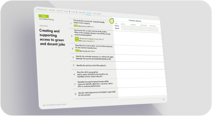 INTRODUCTIONINTRODUCTION PROCESSPROCESS PHASE 1 PHASE 2 PHASE 3 PHASE 4 PHASEPHASE 5 5 CONCLUSIONCONCLUSION Company response: TOOL Plot both the current and desired maturity Just Transition Planning levels of the company LEVEL AD HOC NASCENT ESTABLISHED INTEGRATED Current 1 TOOL Maturity Scale Tool (Phase 3) Desired INDICATOR Summarize the current maturity level position. Creating and What is the company doing to warrant the current supporting 2 maturity level position? TOOL Indicators and Fundamental Actions (Phase 2) TOOL access to green Maturity Scale Tool (Phase 3) and decent jobs Describe the commitments and activities necessary 3 for the desired maturity level TOOL Maturity Scale Tool (Phase 3) 4 Identify the action(s) necessary to address the gaps between the current and desired maturity levels 5 Identify the priority level of the action(s) Describe which geographies 6 and/or assets should be prioritized for the identi昀椀ed actions (where relevant) Describe how performance/success will be 7 measured (identify objectives, outcomes, and/or KPIs to evaluate performance) 8 Identify which department/individual is responsible for the action(s) BSR JUST TRANSITION PLANNING GUIDANCE 50