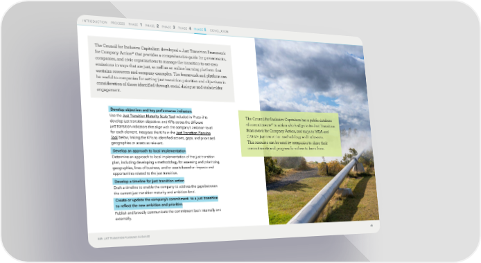 INTRODUCTIONINTRODUCTION PROCESSPROCESS PHASE 1 PHASE 2 PHASE 3 PHASE 4 PHASEPHASE 5 5 CONCLUSIONCONCLUSION The Council for Inclusive Capitalism developed a Just Transition Framework 26 for Company Action that provides a comprehensive guide for governments, companies, and civic organizations to manage the transition to net-zero emissions in ways that are just, as well as an online learning platform that contains resources and company examples. The framework and platform can be useful to companies for setting just transition priorities and objectives in consideration of those identi昀椀ed through social dialogue and stakeholder engagement. Develop objectives and key performance indicators Use the Just Transition Maturity Scale Tool included in Phase 3 to The Council for Inclusive Capitalism has a public database develop just transition objectives and KPIs across the different 27 of commitments to action which align to its Just Transition just transition indicators that align with the company’s ambition-level Framework for Company Action, and maps to WBA and for each element. Integrate the KPIs in the Just Transition Planning CA100+ just transition methodology and indicators. below, linking the KPIs to identi昀椀ed actions, gaps, and prioritized Tool This resource can be used by companies to share their geographies or assets as relevant. Develop an approach to local implementation commitments and progress for others to learn from. Determine an approach to local implementation of the just transition plan, including developing a methodology for assessing and prioritizing geographies, lines of business, and/or assets based on impacts and opportunities related to the just transition. Develop a timeline for just transition action Draft a timeline to enable the company to address the gaps between the current just transition maturity and ambition-level. Create or update the company’s commitment to a just transition to re昀氀ect the new ambition and priorities Publish and broadly communicate the commitment both internally and externally. BSR JUST TRANSITION PLANNING GUIDANCE 45