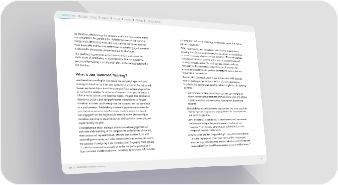 INTRODUCTIONINTRODUCTION PROCESS PHASE 1 PHASE 2 PHASE 3 PHASE 4 PHASE 5 CONCLUSION just transition efforts across the company and in the communities where put people at the heart of the energy transition and ensure that human they are present. Recognizing the challenging nature of this work for 9 rights are respected. energy and utilities companies, it is essential that companies address WBA, in partnership and consultation with 20 other organizations, these trade-offs, and that the commitment to advancing a just transition including the ILO and social partners, has developed a methodology is re昀氀ected in the choices companies make for the future. 10 to assess corporate efforts on the just transition. This methodology This guidance recommends steps to take to better understand the includes just transition planning and is seen as a robust framework implications of contributing to a just transition, how to navigate the to assess company action. The methodology, which includes six process of formulating a just transition plan, and associated actions that indicators for the assessment, comprises a clear framework for can be taken. companies to understand important elements and aspects that are relevant to a just transition. What Is Just Transition Planning? Just transition planning is one of the six indicators that WBA assesses Just transition planning for business is the company’s approach and when evaluating companies’ just transition efforts and disclosures. strategy to transition to a net-zero economy in a manner that is just and Speci昀椀cally, the just transition planning indicator emphasizes the following elements: human-centered. A just transition plan speci昀椀es a company’s priorities, as well as the ambition level across all aspects of the just transition in 1. Just transition planning is founded on company commitments to relation to its activities and business model. The plan also establishes respect human rights, protect and promote decent work, and address objectives, actions, and key performance indicators (KPIs) for just impacts on workers and communities resulting from the net-zero transition activities, and thereby how the company aims to contribute transition. to a just transition. Establishing an internal governance structure for 2. Social dialogue and stakeholder engagement, and more speci昀椀cally just transition and ensuring that senior leadership and the board how companies integrate this engagement in the development of are engaged from the beginning is essential to the process of just just transition planning. transition planning to secure resources and buy-in for developing and 3. KPIs or metrics, or speci昀椀cally “a set of time-bound, measurable implementing the plan. indicators to mitigate the social impacts of the low-carbon Comprehensive social dialogue and stakeholder engagement will 11 on workers, other affected stakeholders, and the transition” enhance understanding of the perspectives and priorities of workers, company’s business relationships. their unions and representatives, affected communities, local and 4. Governance and that “responsibility for the just transition should national governments, and other stakeholders that are foundational to lie at the highest level of decision-making within the company the process of designing a just transition plan. Engaging these groups structure (e.g., at board level), and the individual or committee with is critically important to properly consider the challenges that arise 12 from immense transformation and necessary to co-create solutions that responsibility for it should have expertise on just transition issues.” BSR JUST TRANSITION PLANNING GUIDANCE 7