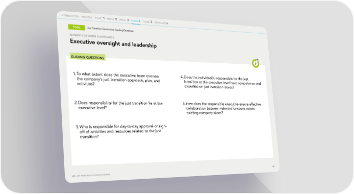 INTRODUCTIONINTRODUCTION PROCESSPROCESS PHASE 1 PHASE 2 PHASE 3 PHASEPHASE 4 4 PHASE 5 CONCLUSIONCONCLUSION TOOL Just Transition Governance Guiding Questions ELEMENTS OF GOOD GOVERNANCE Executive oversight and leadership GUIDING QUESTIONS 1. To what extent does the executive team oversee 4. Does the individual(s) responsible for the just the company’s just transition approach, plan, and transition at the executive level have competence and activities? expertise on just transition issues? 2. Does responsibility for the just transition lie at the 5. How does the responsible executive ensure effective executive level? collaboration between relevant functions across existing company siloes? 3. Who is responsible for day-to-day approval or sign- off of activities and resources related to the just transition? BSR JUST TRANSITION PLANNING GUIDANCE 40