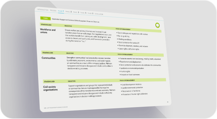 INTRODUCTION PROCESS PHASEPHASE 1 1 PHASE 2 PHASE 3 PHASE 4 PHASE 5 CONCLUSION TOOL Stakeholder Engagement Guidance: De昀椀ne Engagement Focus and Objectives STAKEHOLDER OBJECTIVE FOCUS OF ENGAGEMENT Workforce and Ensure workers are actively informed and involved in just • Social dialogue and negotiations with workers unions transition plans from an early stage; that negotiations occur; and • Re- or up-skilling that workers bene昀椀t from training and skills development, have • Working conditions access to decent and quality jobs, and have social protection • Social protection for workers19 during the transition “out.” • Talent development, retention, and inclusion • Labor rights and human rights STAKEHOLDER OBJECTIVE FOCUS OF ENGAGEMENT Communities Strengthen communities’ resilience to the net-zero transition • Access to essential services (energy, mobility, health, education) by addressing economic, environmental, and social impacts • Resettlement and displacement on communities as a result of the company’s actions. Maintain • Social protection and economic diversi昀椀cation for communities transparent and inclusive dialogue and include communities in decision-making processes. • Land and environmental protection • Human rights • Impacts on local businesses STAKEHOLDER OBJECTIVE FOCUS OF ENGAGEMENT Civil society Support organizations and groups that represent individuals • Local development initiatives organizations or communities that are most exposed to the negative • Land/environmental protection consequences of the transition to a net-zero economy. Maintain • Reconversion of territories transparent and inclusive dialogue and include civil society organizations in decision-making processes. • Protection of human rights defenders BSR JUST TRANSITION PLANNING GUIDANCE 18