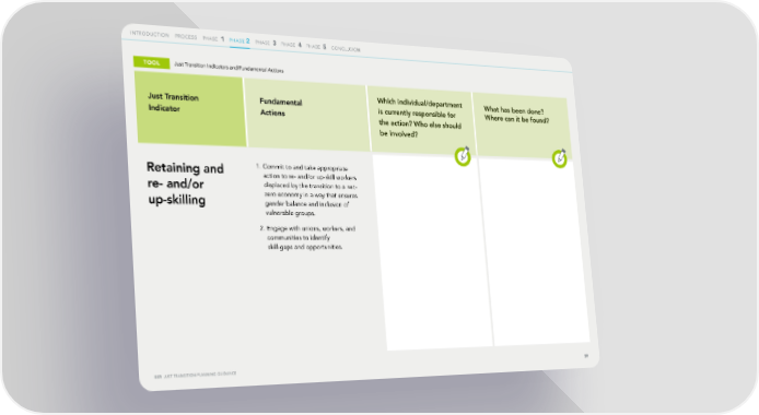 INTRODUCTION PROCESS PHASE 1 PHASEPHASE 2 2 PHASE 3 PHASE 4 PHASE 5 CONCLUSION Just Transition Indicators and Fundamental Actions TOOL Just Transition Fundamental Which individual/department What has been done? Indicator Actions is currently responsible for Where can it be found? the action? Who else should be involved? Retaining and 1. Commit to and take appropriate action to re- and/or up-skill workers re- and/or displaced by the transition to a net- up-skilling zero economy in a way that ensures gender balance and inclusion of vulnerable groups. 2. Engage with unions, workers, and communities to identify skill-gaps and opportunities. BSR JUST TRANSITION PLANNING GUIDANCE 29